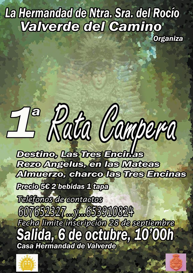 Para el 6 de octubre anuncia su primera ruta campera, con un destino, el Charco de las Tres Encinas en la ribera valverdeña, el rezo del ángelus se hará en el paraje de Las Mateas y el almuerzo y convivencia en el Charco de las Tres Encinas. Están invitados todos los rocieros de Valverde así como los amantes del campo y los caballos y pueden acudir en caballo, charré, andando etc..