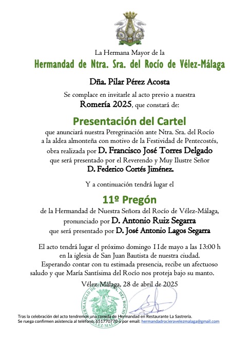 Adjunto invitación a los actos de preparación de la Romería de Pentecostés 2025.