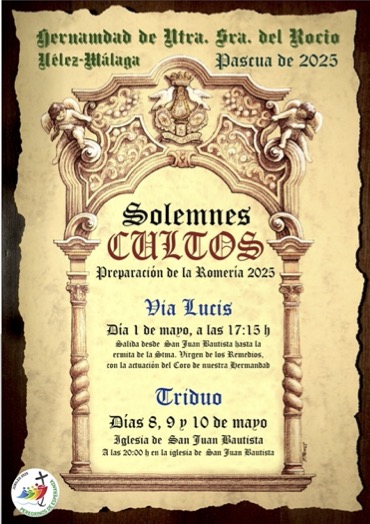 Del jueves 8 al sábado 10 de mayo, 20:00 h. Triduo en honor y gloria de la Santísima Virgen del Rocío.