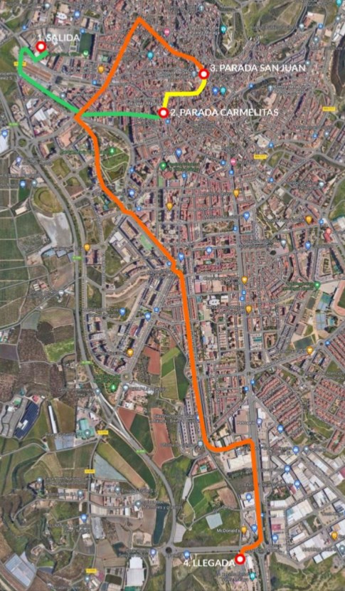 Haremos un recorrido por la ciudad con una breve parada en Las Carmelitas, donde tendremos la despedida de la Corporación Municipal y los Medios de Comunicación; después iremos hasta San Juan, donde haremos una ofrenda floral a nuestro Bendito Simpecado. Finalmente, el itinerario seguirá por distintas calles de Vélez hasta llegar a la Explanada del Recinto Ferial alrededor de las 12 del mediodía.