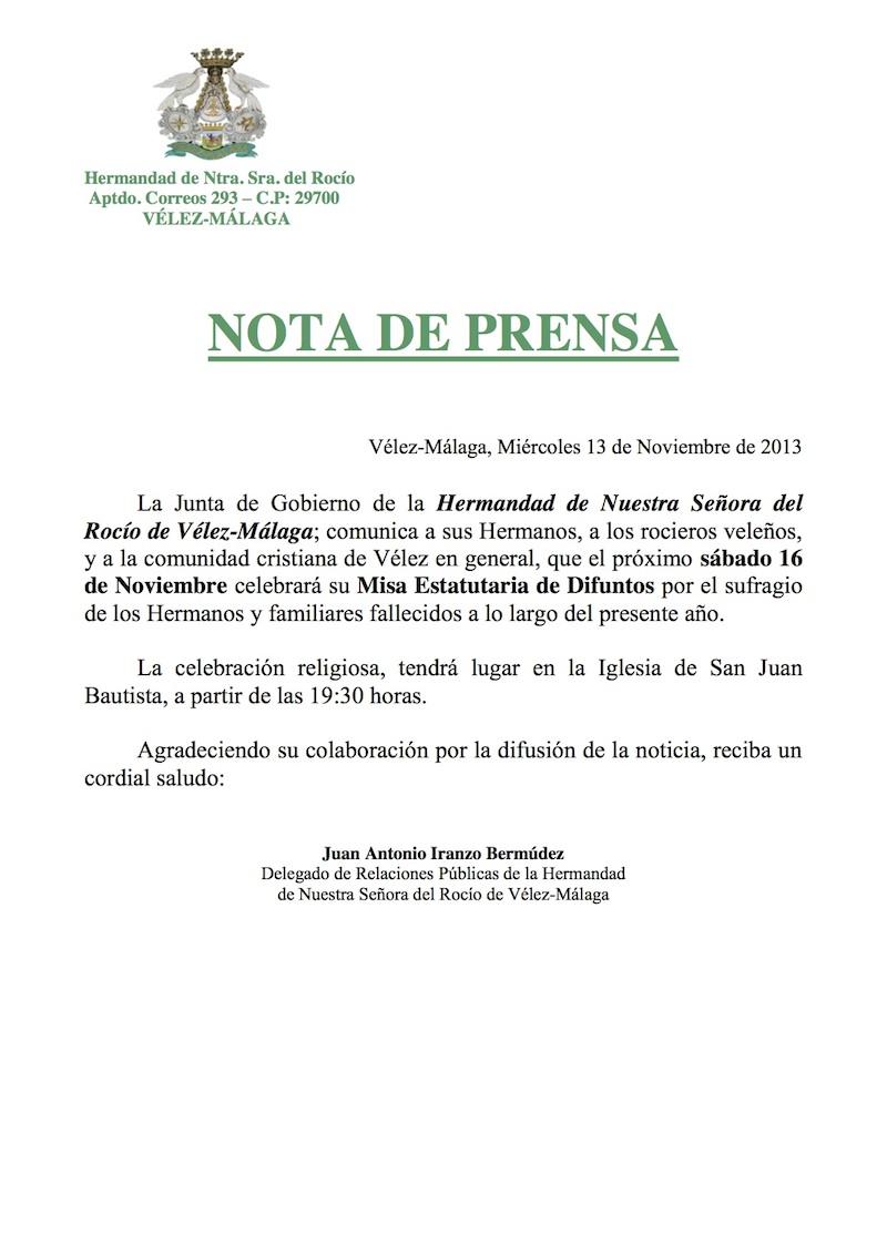 La Hdad. de Vélez Málaga celebra el próximo 16 de noviembre su Misa Estatutaria de Difuntos.