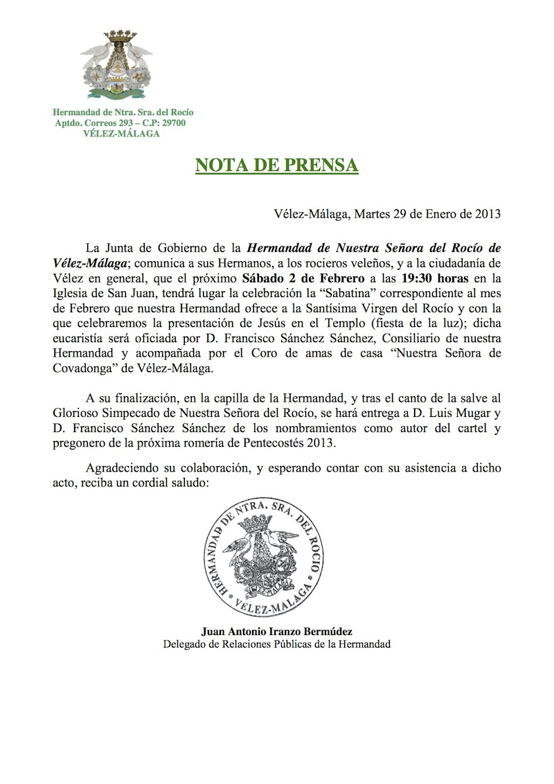 Hdad. de Vélez-Málaga – Sabatina y nombramientos del autor del cartel y del pregonero de la próxima romería 2013