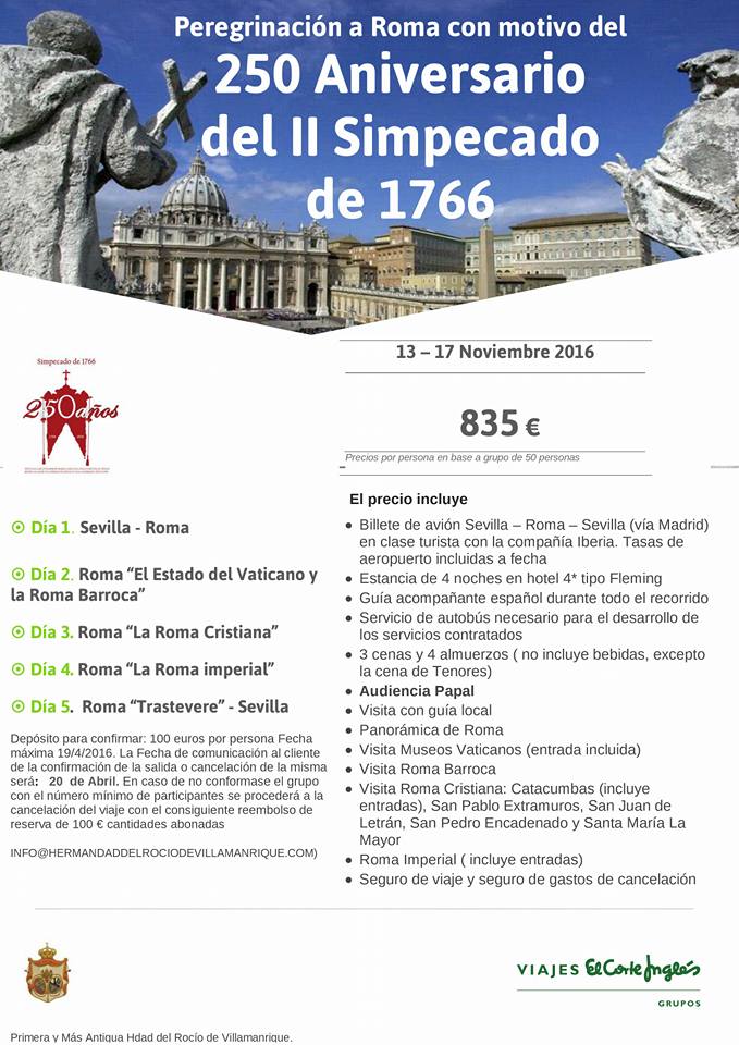 La Hermandad de Villamanrique organiza una Peregrinación a Roma del 13 al 17 de noviembre de 2016 con motivo del 250 Aniversario del II Simpecado de 1776.
