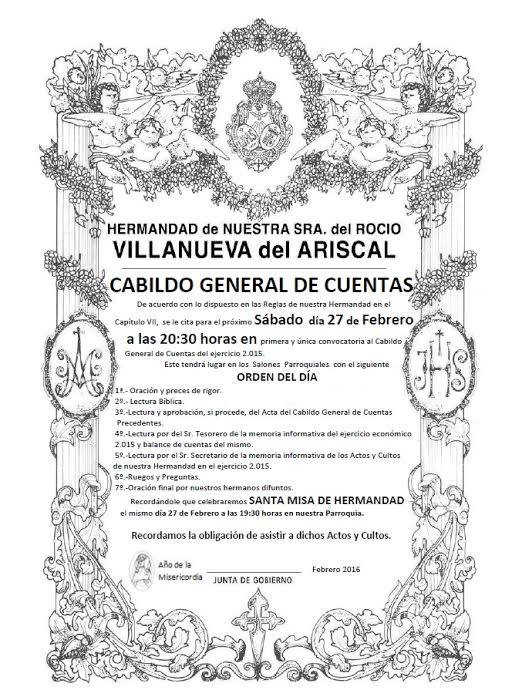 La Hermandad de Villanueva del Ariscal convoca el Cabildo General de Cuentas para el sábado 27 de febrero de 2016.