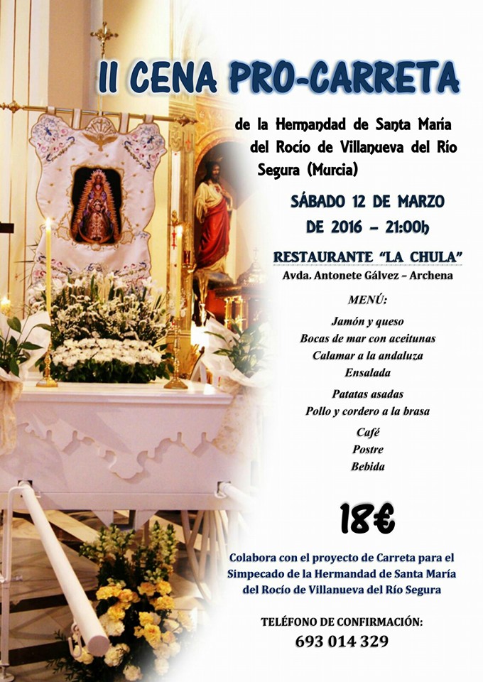 La Hermandad de Villanueva del Río Segura organiza la II Cena Pro-Carreta 2016 el dsabado 12 de marzo de 2016.