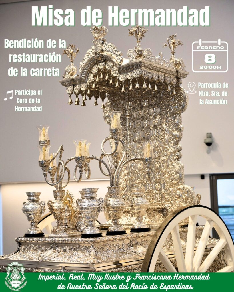El próximo sábado 8 de febrero, a las 20:00h, celebraremos Misa de Hermandad en la Parroquia Asuncion Espartinas Pero será muy especial porque aprovecharemos para la bendición de la restauración de la carreta de plata, que estará expuesta para que pueda ser contemplada por todos los hermanos y devotos. Acompañará con sus cantes el Coro de la Hermandad de Ntra. Sra. del Rocío de Espartinas.