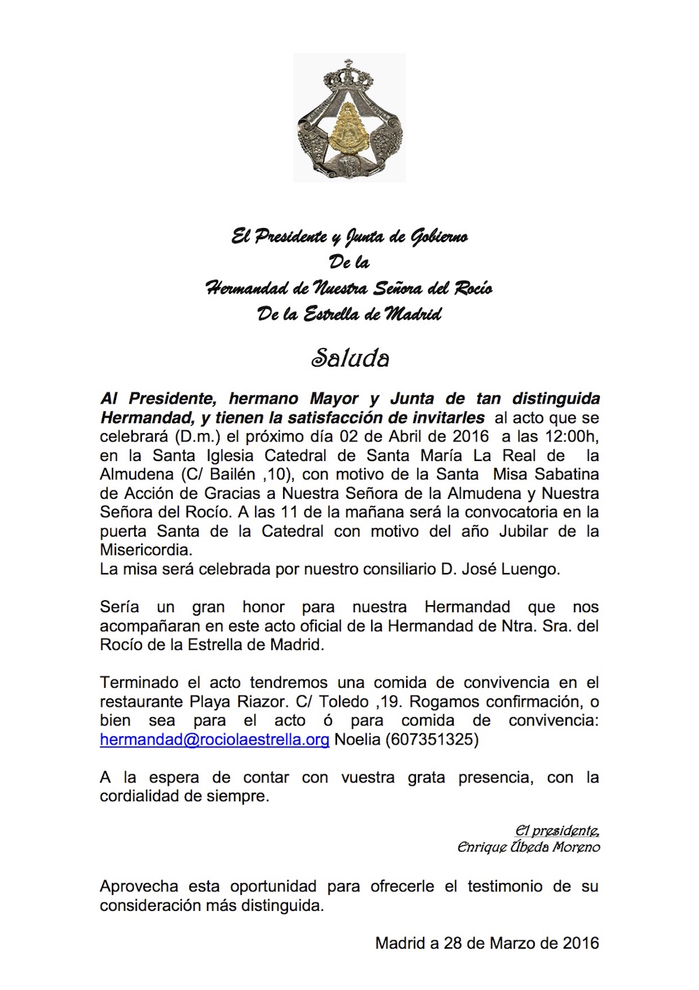 Saluda de nuestro acto que se celebrará (D.m.) el próximo día 02 de Abril de 2016 a las 11:00h, en la Santa Iglesia Catedral de Santa María La Real de la Almudena (C/ Bailén ,10).