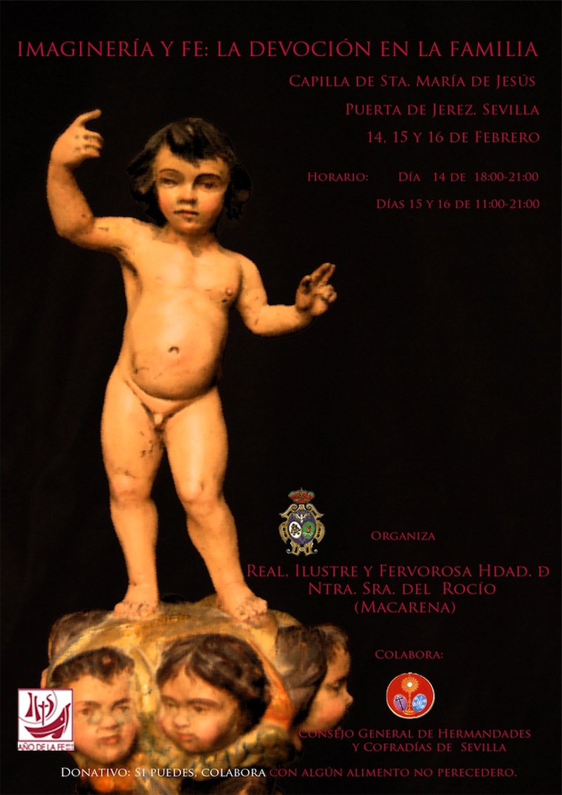 Los próximos días 14, 15 y 16 del presente mes, en la Capilla de Santa María de Jesús (Capilla del Consejo General de Hermandades y Cofradías de la Cuidad de Sevilla) tendrá lugar la Exposición que bajo el titulo “Imaginería y Fe: La devoción en la Familia”, Tallas Religiosas Particulares Privadas que organiza nuestra Hermandad.