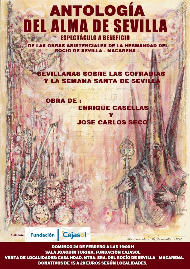 El próximo 24 de febrero en la Sala Joaquín Turina, Fundación Cajasol, organiza el Espectáculo Benéfico “Antología del Alma de Sevilla” Obra de Enrique Casellas y José Carlos Seco a Beneficio de nuestras Obras Asistenciales. Las entradas están a la venta en nuestra Casa Hermandad de Calle Parras, 32.