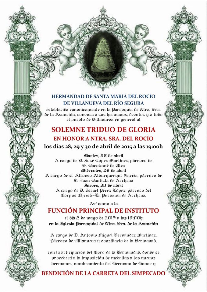 Comienzan los actos previos organizados por nuestra Hermandad Del Rocío Villanueva Del Río Segura, que culminarán el próximo día 10 de mayo, cuando nuestro glorioso Simpecado recorra las calles de Villanueva sobre su nueva carreta. desde la Junta de Gobierno, esperamos e invitamos a todos los hermanos, vecinos y devotos de la Stma. Virgen a participar y disfrutar de los mismos.