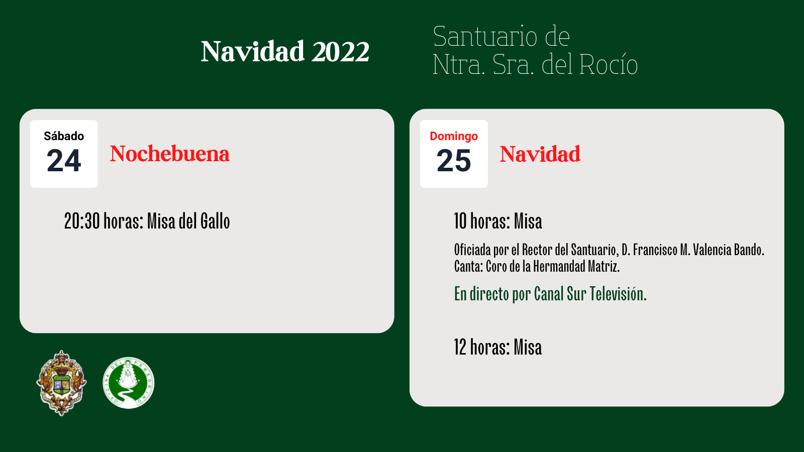 El Coro de la Hermandad Matriz, el Coro Infantil y el de Mayores de Almonte, ofrecerán un recital de villancicos el día 22, a las 7 de la tarde. Y al día siguiente, a las 7 y media, lo hará el Coro de la Hermandad del Rocío de Huelva, con la presentación de su nuevo disco “Bendito Niño”.