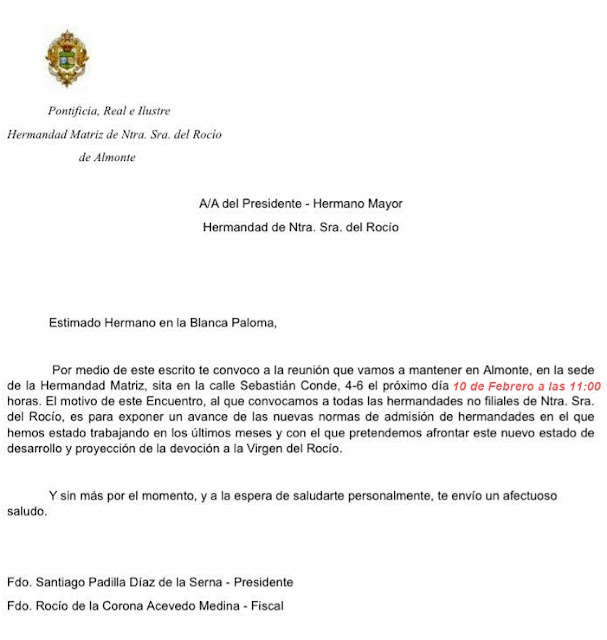 A continuación reproducimos la carta enviada a cada una de las Hermandades No Filiales.