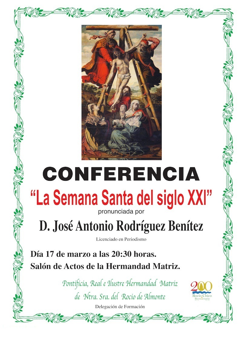 Mañana sábado, a las 20:30 horas, tendrá lugar en la Casa Hermandad una Conferencia que lleva por título “La Semana Santa del siglo XXI” estará a cargo del periodista y escritor D. José Antonio Rodríguez Benítez.