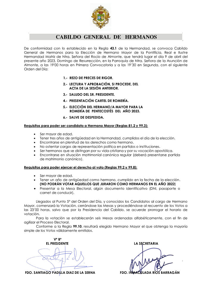 Con motivo del Cabildo de Elección del Hermano/a Mayor para la próxima romería, siguiendo con lo establecido en nuestras Reglas, 📑 el Censo Electoral permanece expuesto en la Casa Hermandad para su comprobación hasta el 31 de marzo.