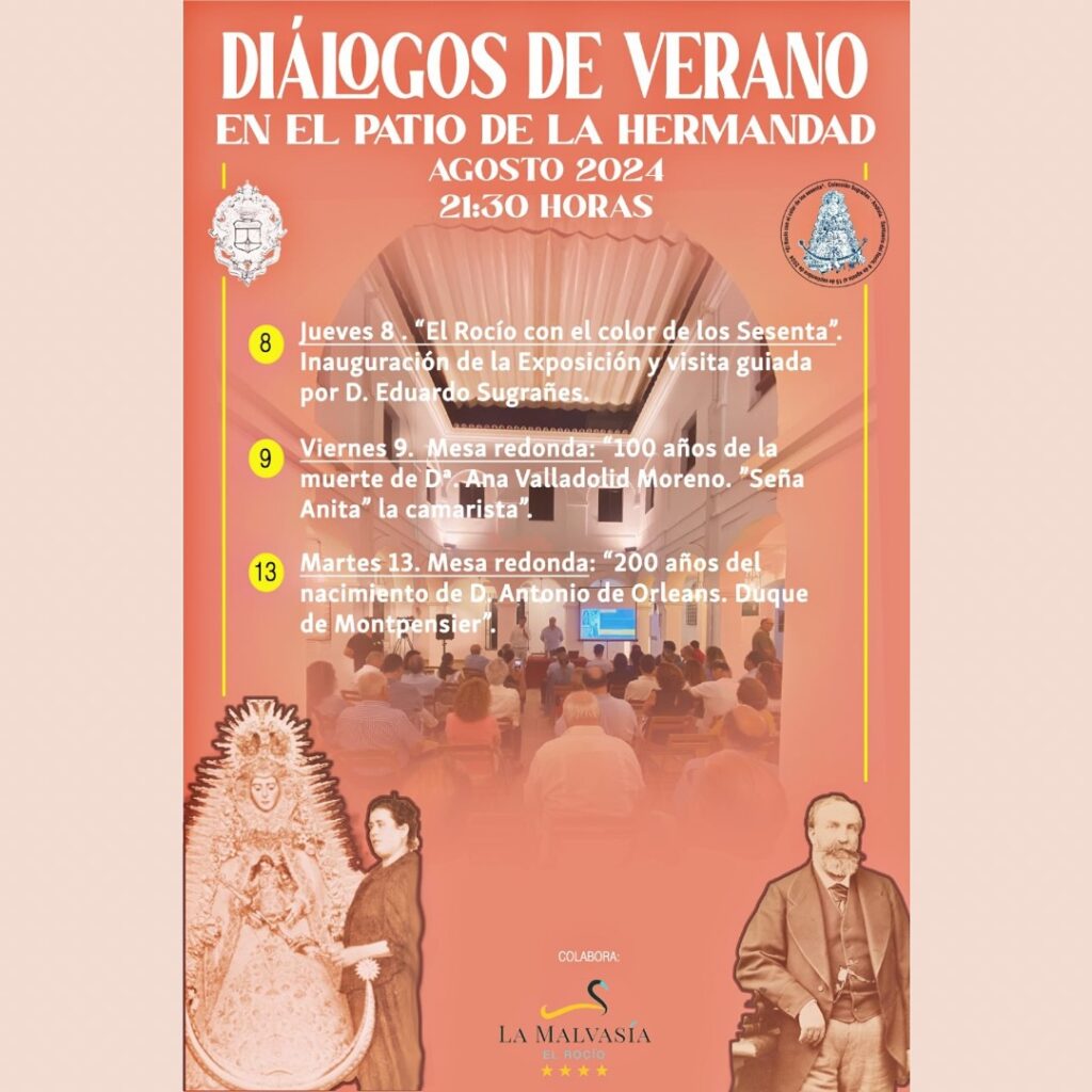 Por tercer año consecutivo convertimos el patio de nuestra Casa-hermandad en El Rocío en un espacio de encuentro, de conocimiento y de difusión de la devoción rociera. Los días, 8, 9 y 13 de agosto, después de la Misa de la tarde en El Santuario.