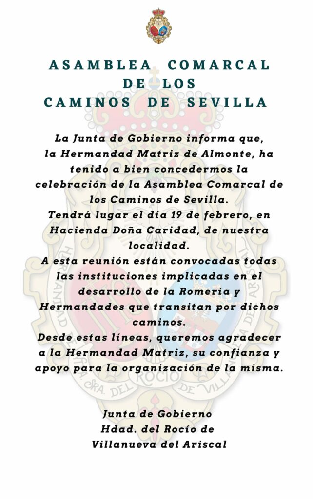 A la semana siguiente, el sábado 19, será la segunda el turno de la asamblea de los caminos de Sevilla, en Villanueva del Ariscal; y en marzo, el sábado 12, la tercera en el Palacio de las Marismillas, en el Parque Nacional de Doñana, acogerá la Asamblea de los Caminos de Cádiz.