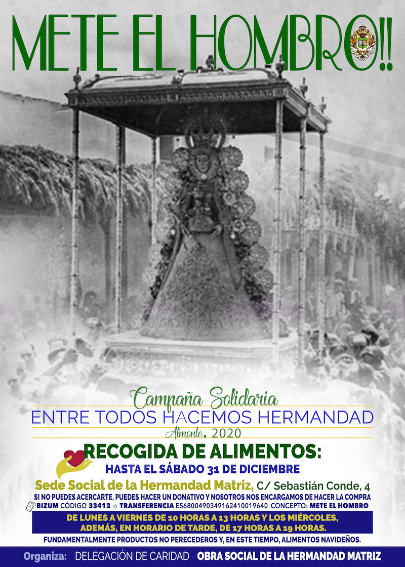 Se centra esta programación en la Obra Social, cuando más falta hace. Por ello, desde la delegación de caridad trabajan en una acción solidaria que han llamado “Mete el hombro”. Hasta el 31 de diciembre, quienes quieran podrán acercarse a la Sede Social de la Hermandad Matriz, en la calle Sebastián Conde, 4 y entregar alimentos. El horario establecido para su recogida es de lunes a viernes, de 10 horas a 13 horas y los miércoles, además, en horario de tarde, de 17 horas a 19 horas.