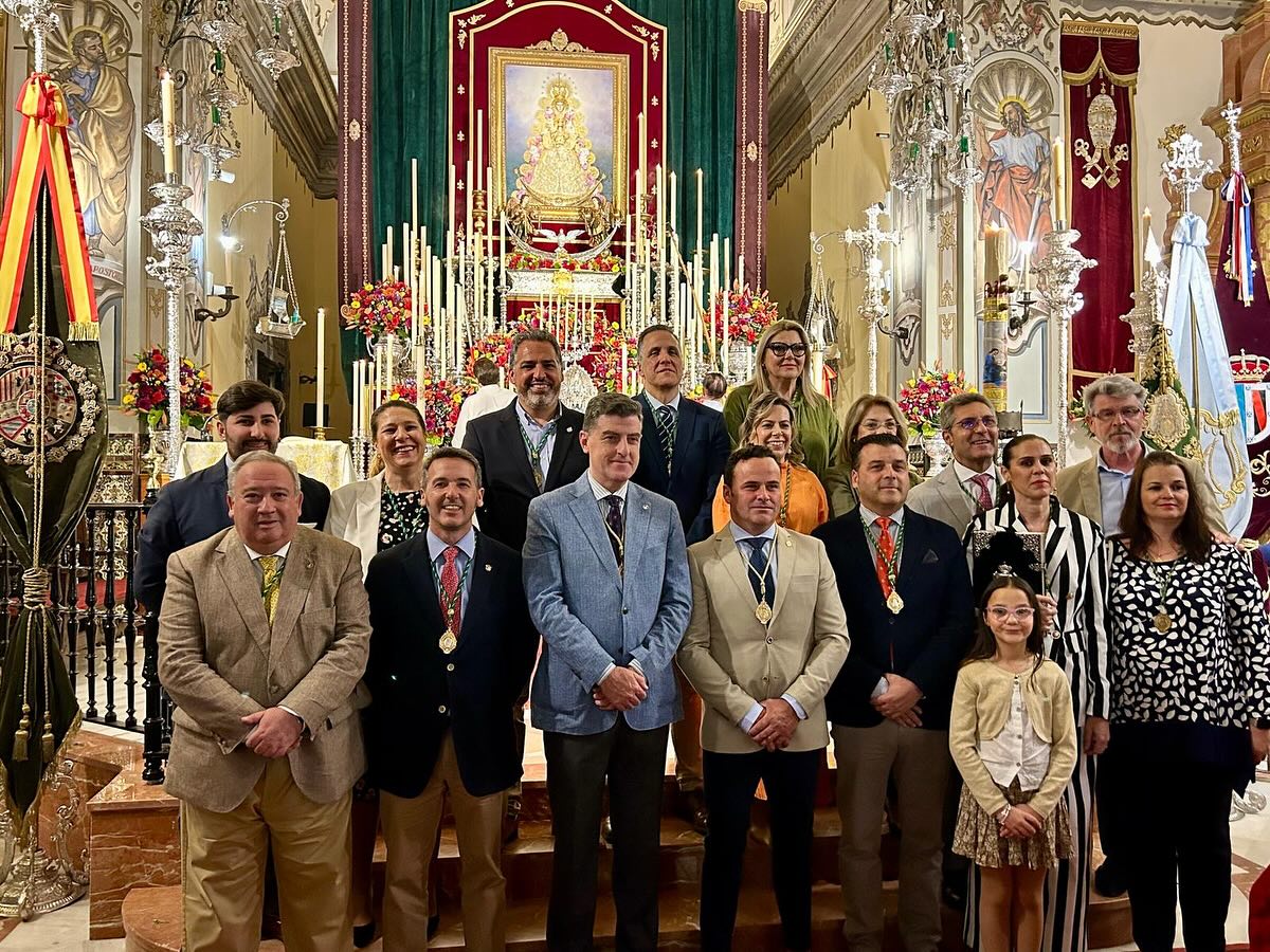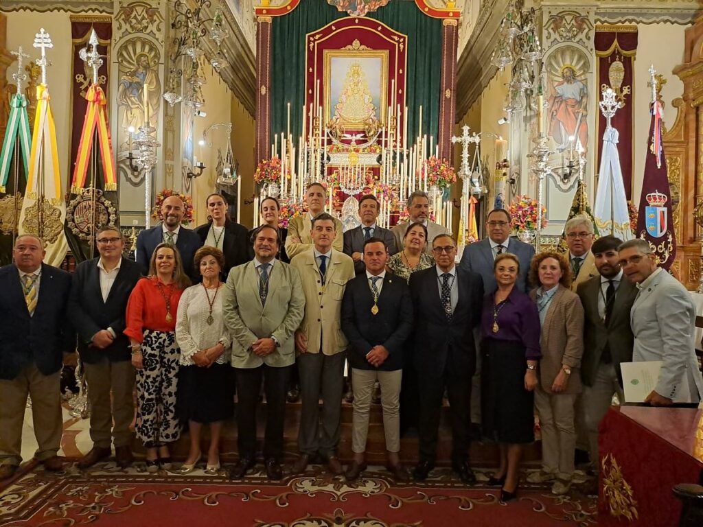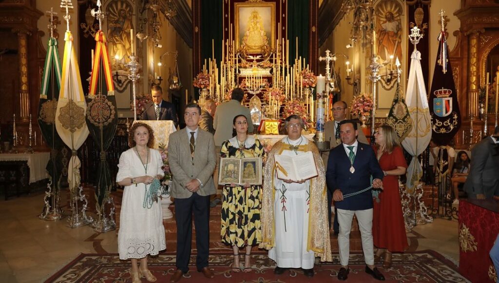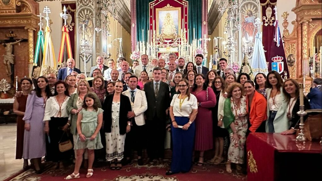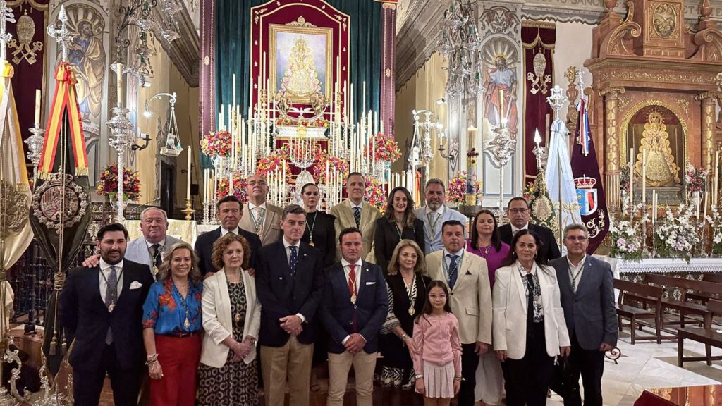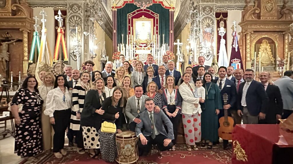 En la tarde del 3 de mayo de 2024 iniciamos la Novena con este altar espectucular montado por nuestra Delegación de Culto y Protocolo. Dicho altar está presidido por el lienzo de la Virgen del Rocío, perteneciente al tríptico realizado por el pintor Juan Valdés en el año 2010, en óleo sobre lienzo. En el conjunto destaca la solemnidad del Tabernáculo gótico de plata.