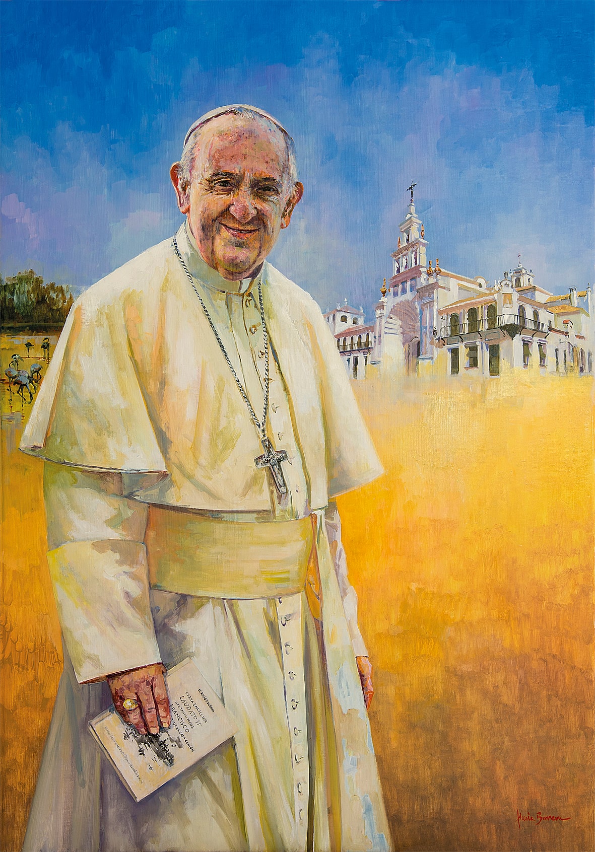 La obra ha sido realizada por la artista sevillana Nuria Barrera y se trata de un óleo sobre lienzo de lino belga. En ella aparece Su Santidad sujetando en su mano derecha la edición publicada por la Hermandad Matriz, con la autorización de la Santa Sede, de su Encíclica Laudato Si´, dedicada al Medioambiente.