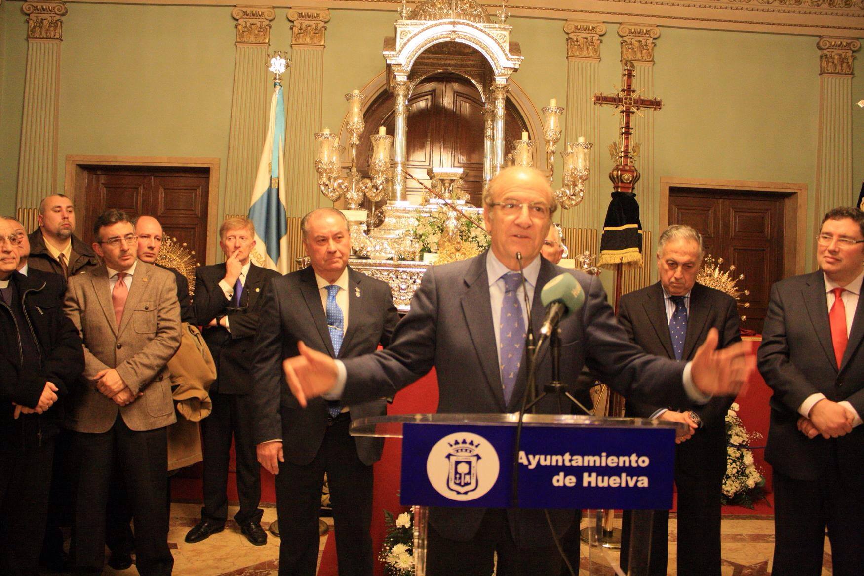 La Pontificia, Real e Ilustre Hermandad Matriz de Ntra. Sra. del Rocío de Almonte, atendiendo la solicitud formulada por la Hermandad de la Cinta y el Consejo de Hermandades de Huelva, participa en la Magna Exposición que se celebra en la capital de nuestra provincia, en el salón de plenos de su Ayuntamiento, con motivo del cincuenta aniversario del patronazgo de Ntra. Sra. de la Cinta, sobre la ciudad de Huelva.