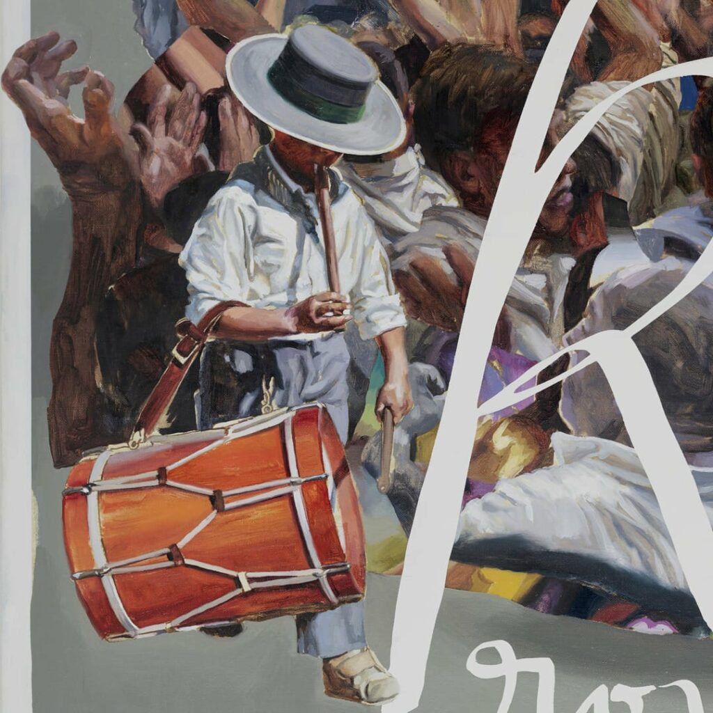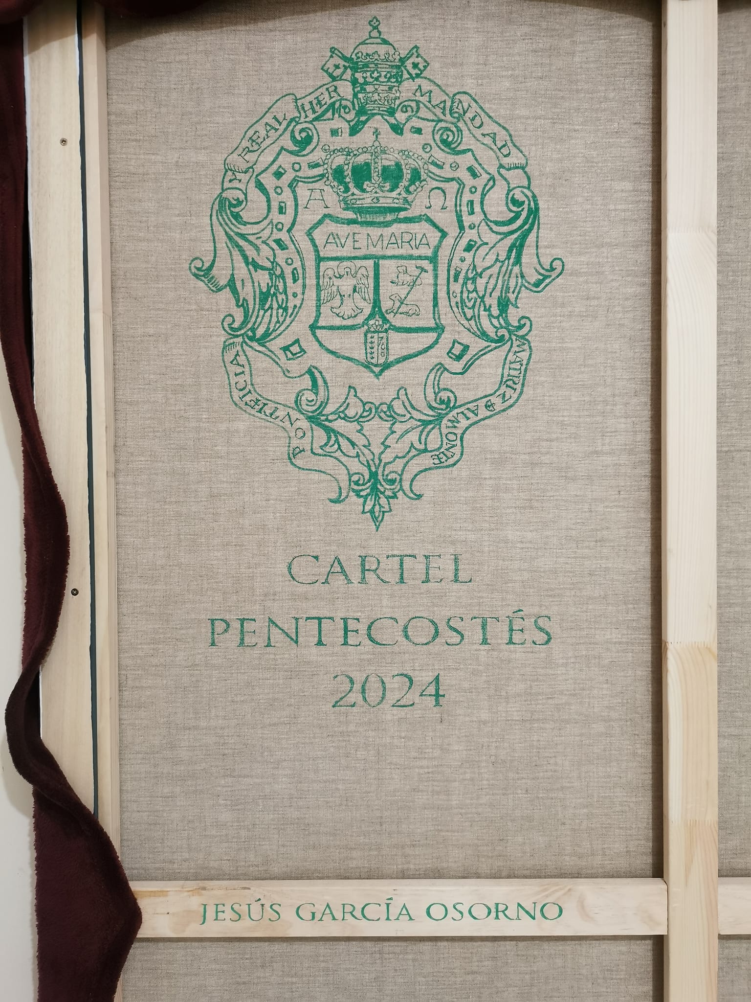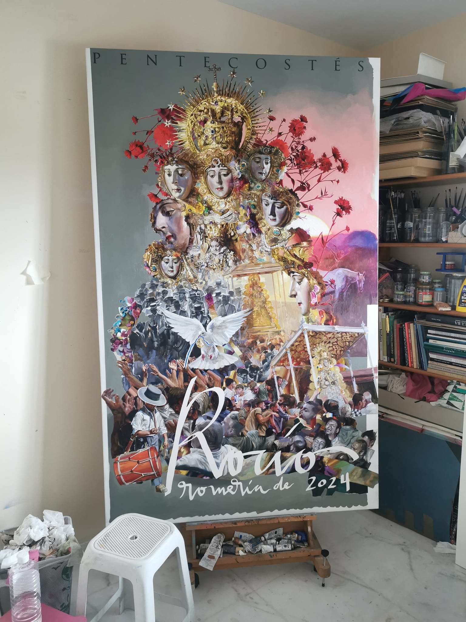 La ermita, con su concha peregrina y su espadaña, su altar y su camarín, tiene la altura de un monte santo. Se alza erguida, triangular, forma perfecta, presencia de Dios. Y en la cima florece la zarza siempre ardiente de la fe, que no se consume, sino que se multiplica. La Virgen del Rocío es, en su inmortal estampa triangular, el signo eterno de un Dios que mira a su pueblo por los ojos de María Santísima del Rocío. El cartel retrata y refuerza esa definición iconográfica, ha descrito el pintor onubense.