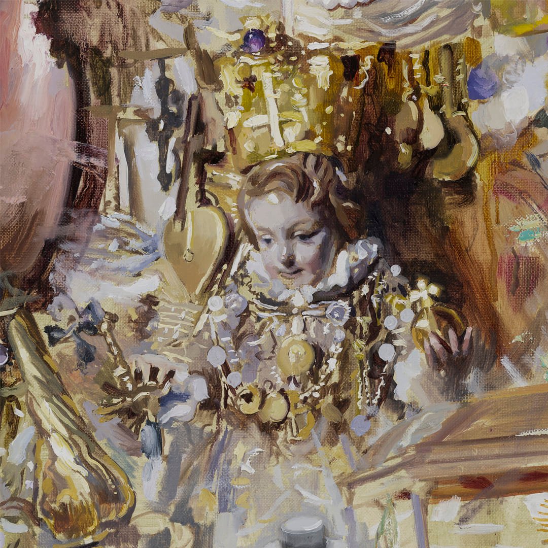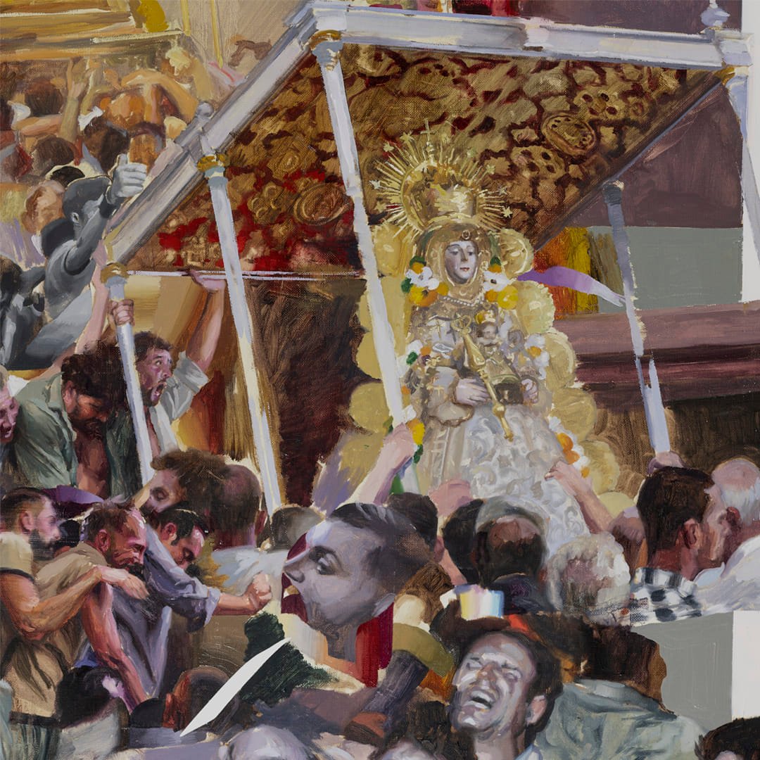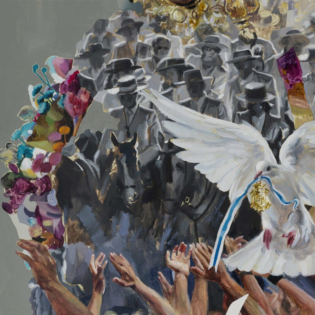 La imaginación del artista se fija en que “todo el que entra en el Santuario, siente que la Virgen del Rocío le está mirando, sigue sus pasos, le acompaña y atiende sus súplicas”. Pero cada uno la mira de una forma diferente y encuentra en Ella una imagen única, que ve con sus ojos y otros no pueden ver. La mira desde un encuadre distinto, la busca de frente, desde más lejos o desde la inmediata proximidad de la reja. Una Reina que todo lo puede, y todo lo abraza. Un Dios que desciende por Ella, porque Ella fue camino de Dios hasta la tierra. Un Dios que todo lo ve porque en, El Rocío, todos los ojos están vueltos a su Madre.