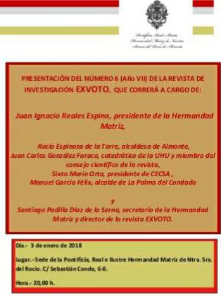 Como ya es tradición, el próximo miércoles 3 de enero, a las 20,00 horas, presentamos el número 6 (VII Año) de la revista de investigación EXVOTO, que trae a su portada el espléndido lienzo de Manuel García Rodríguez (1917), con nuevos trabajos de investigación que nos iluminan diversos aspectos de la historia de la devoción rociera. Es la culminación del esfuerzo de todo un año. Sí te apetece, te esperamos en nuestra sede.