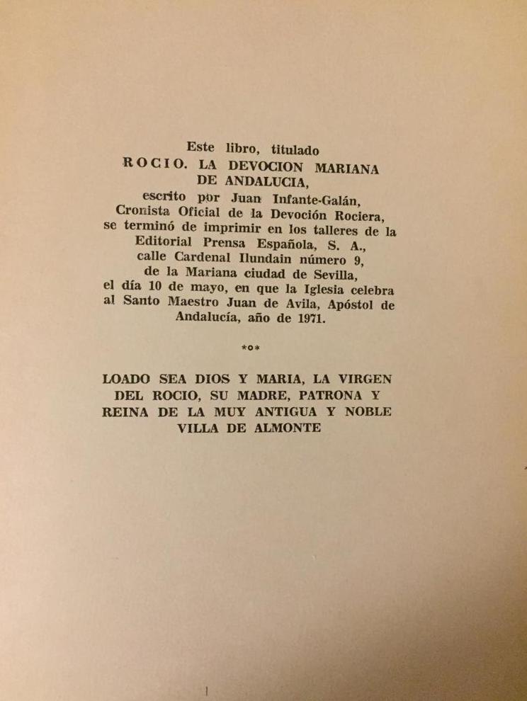 Es uno de los libros más relevantes de la literatura rociera. En el, su autor, sirviéndose de fuentes primarias, pretende ofrecer una descripción comprensiva de la devoción a la Virgen del Rocío, desde una perspectiva fundamentalmente histórica, centrada en su relación con el pueblo de Almonte.