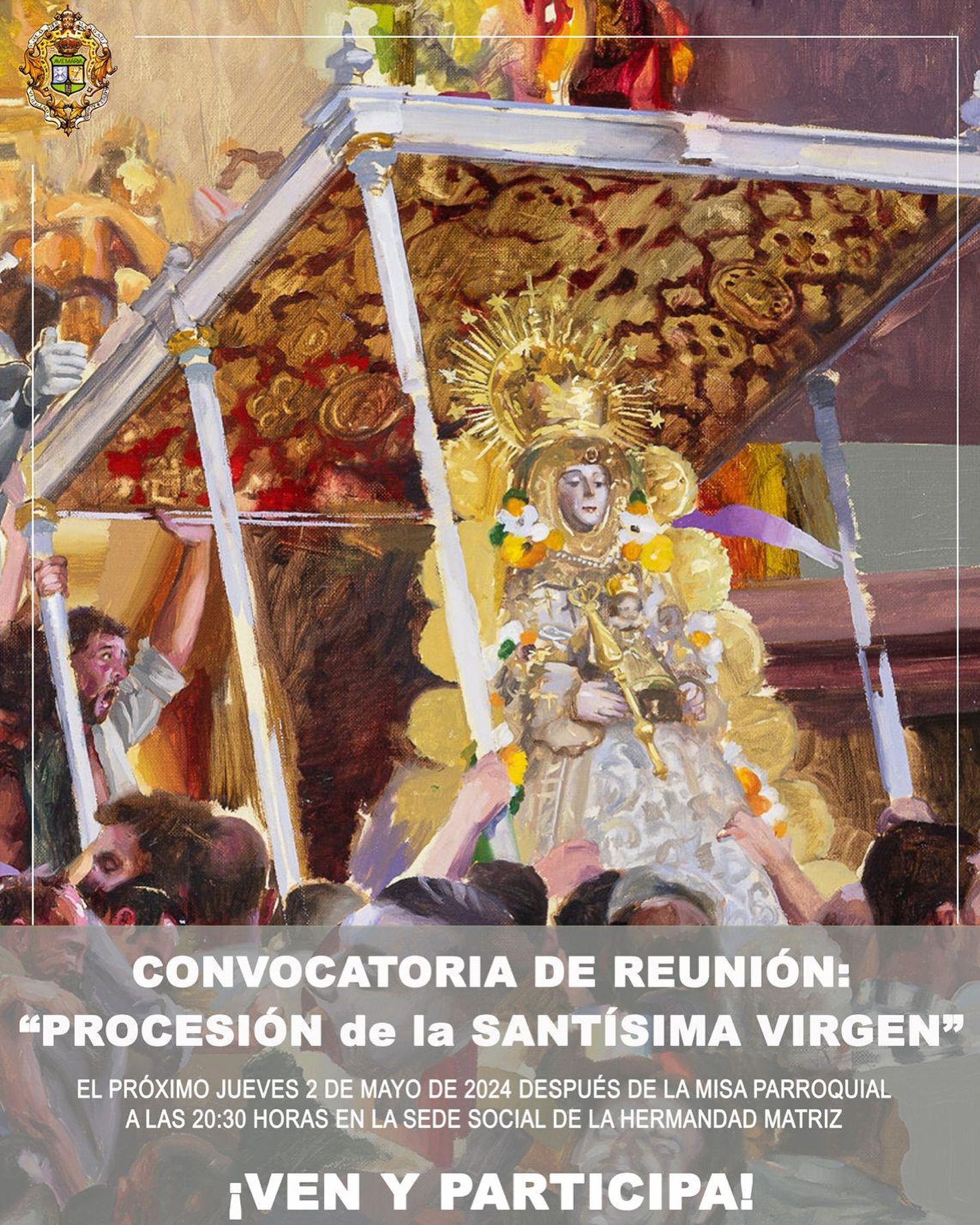 En la tarde del 2 de amyo de 2024 convocamos a nuestros hermanos y al pueblo de Almonte a una reunión para tratar este tema tan importante y sensible para todos. Participa activamente y colabora !!!!. Entre todos hagamos la Procesión que nuestra Madre se merece !!!!. A las 20,30 horas en la Casa de la Matriz.