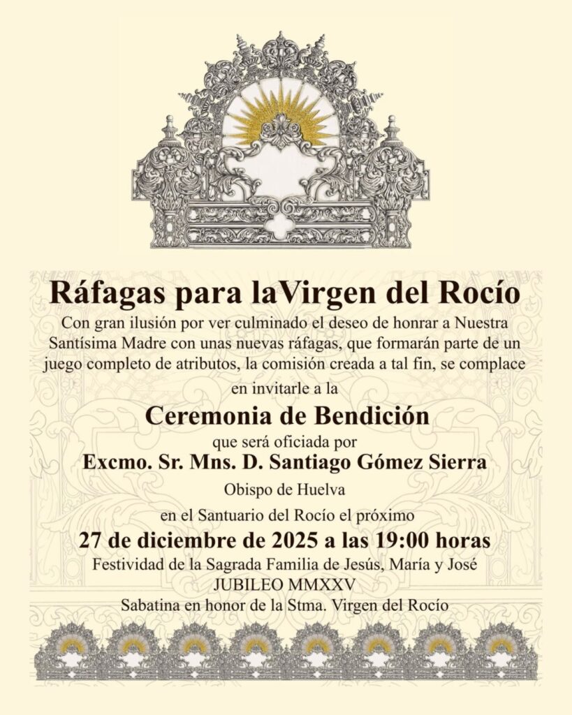 A continuación, se procederá a la 𝗰𝗲𝗿𝗲𝗺𝗼𝗻𝗶𝗮 𝗱𝗲 𝗯𝗲𝗻𝗱𝗶𝗰𝗶ó𝗻 𝗱𝗲𝗹 𝗰𝗼𝗻𝗷𝘂𝗻𝘁𝗼 𝗱𝗲 𝗻𝘂𝗲𝘃𝗼𝘀 𝗮𝘁𝗿𝗶𝗯𝘂𝘁𝗼𝘀, diseñados por Chesco Fernández y realizados en el taller de orfebrería de Ricardo, de Sanlúcar de Barrameda, para Nuestra Santísima Madre, la Virgen del Rocío, sufragados por suscripción popular de sus devotos (en nuestra web están todos los detalles del conjunto).
