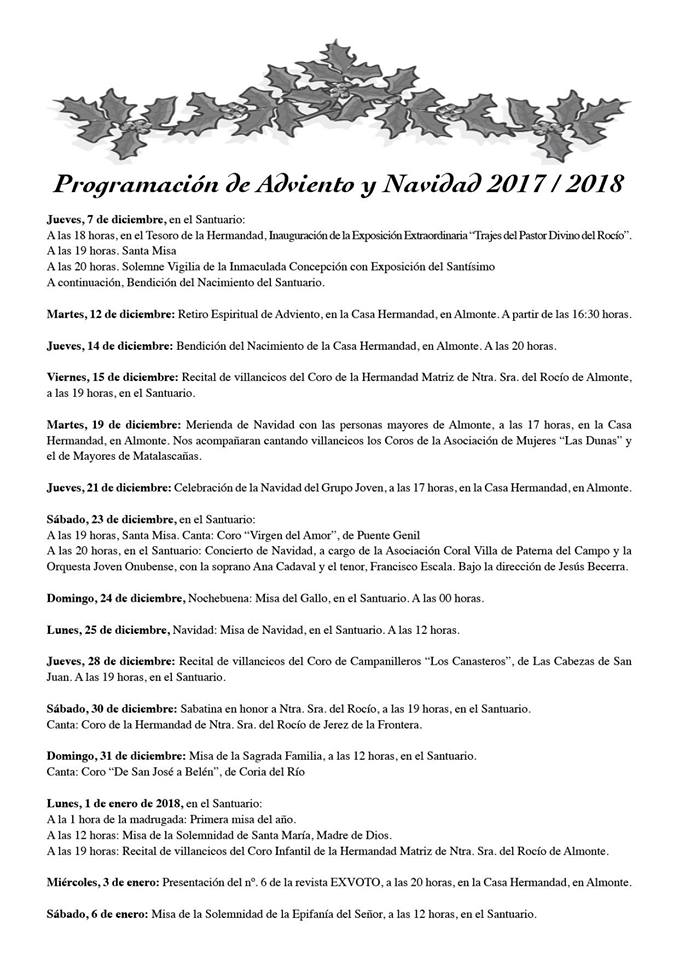 El próximo jueves, 7 de diciembre, iniciamos la programación de Adviento y Navidad de la Hermandad, con la Solemne Vigilia de la Inmaculada Concepción, en el Santuario, a las 20 horas, con Exposición del Santísimo. Antes, a las 19 horas, Santa Misa.