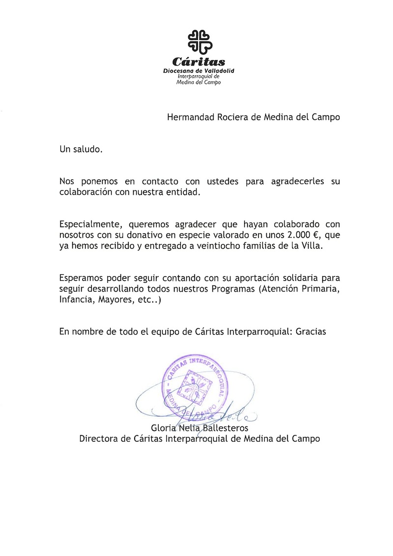 El pasado dia 23 de Diciembre, hicimos entrega a Caritas Diocesanas, en la oficina de aqui de Medina del Campo, de una importante cantidad de alimentos, lo que mas nos indujo hacerlo y a acomunicarlo es que mas de la mitad de la entrega, se llevo a cabo, en alimentos perecederos (pesacado, carne y frutas frescas), otra gran parte era de productos navideños (turrones, mazapan, pan de higo, etc.) y el resto productos que ya por todos es conocido.