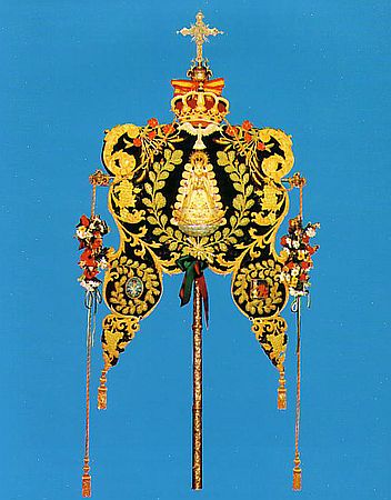 Es de gran originalidad por su forma y por sus picos inferiores circulares. Confeccionado en hilo de oro y sedas de colores, sus elementos más característicos son las ramas de encina que envuelven a la imagen de la Virgen del Rocío, y los escudos de armas del arzobispado de Badajoz y de la propia ciudad, colocados en los extremos redondeados de abajo.