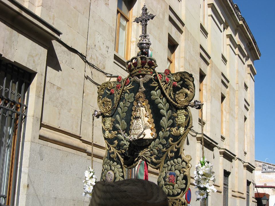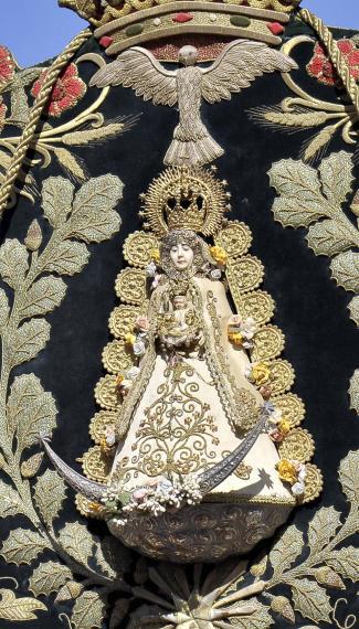 Fabricada en metal plateado, la Virgen aparece rodeada de dos ramas de encina y apoyada sobre un lienzo de muralla con dos torres, todo ello simbolos de la ciudad y de la zona geográfica. Las ramas se unen en su parte superior para sostener una corona Real.