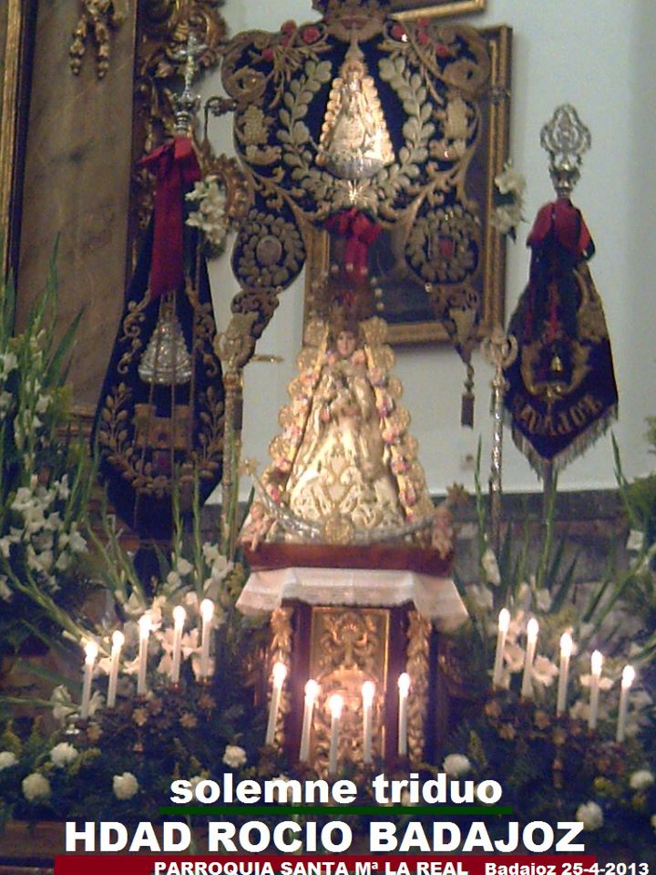 El 29 de Mayo de 1990 el Obispado de Badajoz aprueba la Asociacion Pro Hermandad , el 22 de Mayo de 1992 el Obispado aprueba La Hermandad del Rocio para todo el territorio de la Diócesis de Badajoz y el 9 de Marzo de 1993 por fin la Pontificia Real e Ilustre Hermandad Matriz de Almonte, nombra HERMANDAD FILIAL a la Hermandad Ntra.Sra. del Rocio de Badajoz.