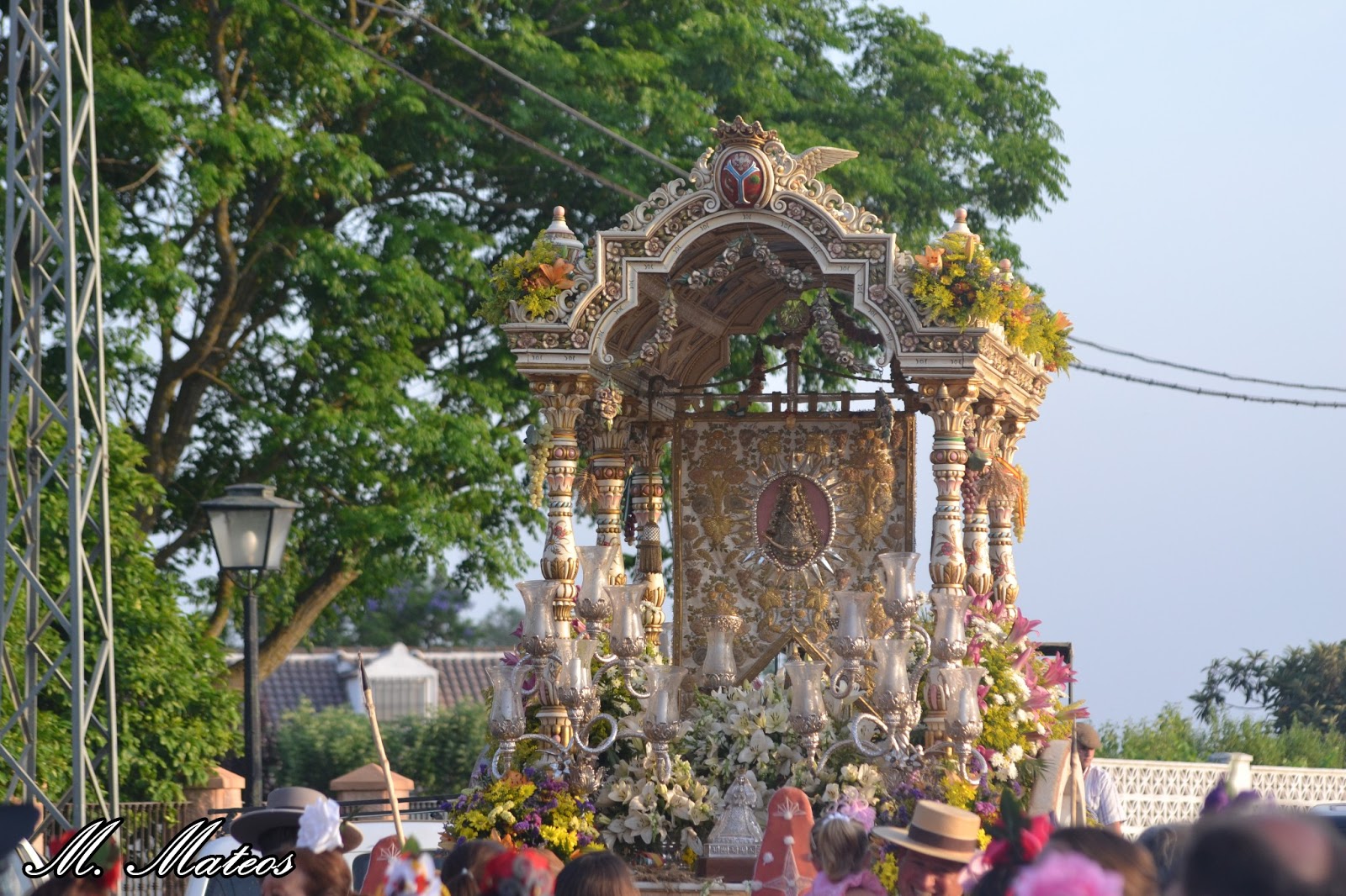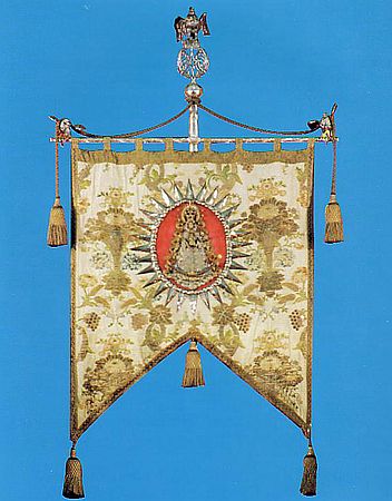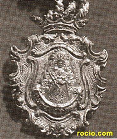 Fabricada en metal plateado, con la figura de la Virgen en dorado y con sus atributos de Reina; diadema, ráfagas, rostrillo, cetro, saya bordada, media luna a los pies y el Pastorcillo en los brazos. Toda ella rodeada de de volutas y trozos de pergaminos ajironados. Se timbra el conjunto con una corona abierta de estilo marquesal.