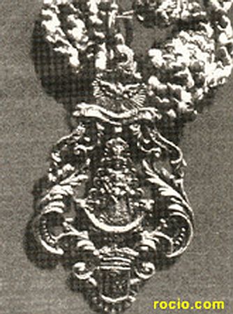 Fabricada en metal plateado, con la figura de la Virgen con sus atributos de Reina; diadema, ráfagas, rostrillo, cetro, saya bordada, media luna a los pies y el Pastorcillo en los brazos. Toda Ella rodeada de de volutas y hojas de acanto. En la base dos volutas rematan el escudo de la ciudad. Una cinta flotante lleva la inscripción » Hermadad de Bollullos del Condado» y encima una paloma con las alas abiertas sobre unas ráfagas.
