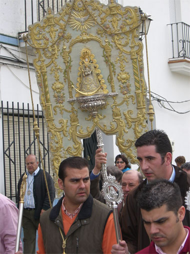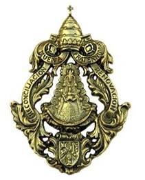 Fabricada en metal plateado, con la figura principal de la Virgen con sus atributos de Reina; diadema, ráfagas, rostrillo, cetro, saya bordada, media luna alos pies y el Pastorcillo en los brazos. La Virgen esta flanqueada por hojas de acanto que rematan en la parte superior en una corona pontifical aompañada de las llaves pontificias. En la parte inferior y sobre un pergamino ajironado, un blasón con elementos de la Orden fundada por Santo Domingo de Silos, Patrón de Bormujos. A cada lado de la Imagen de Ntra. Sra. se encuentra una cinta flotante con la inscripción «Reconciliación. Nueva Fraternidad. Renovación.» Lema de la Hdad.