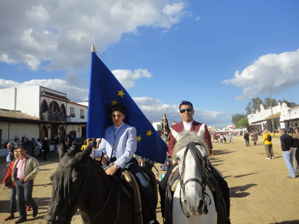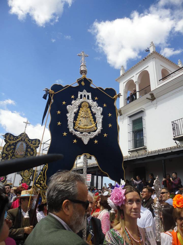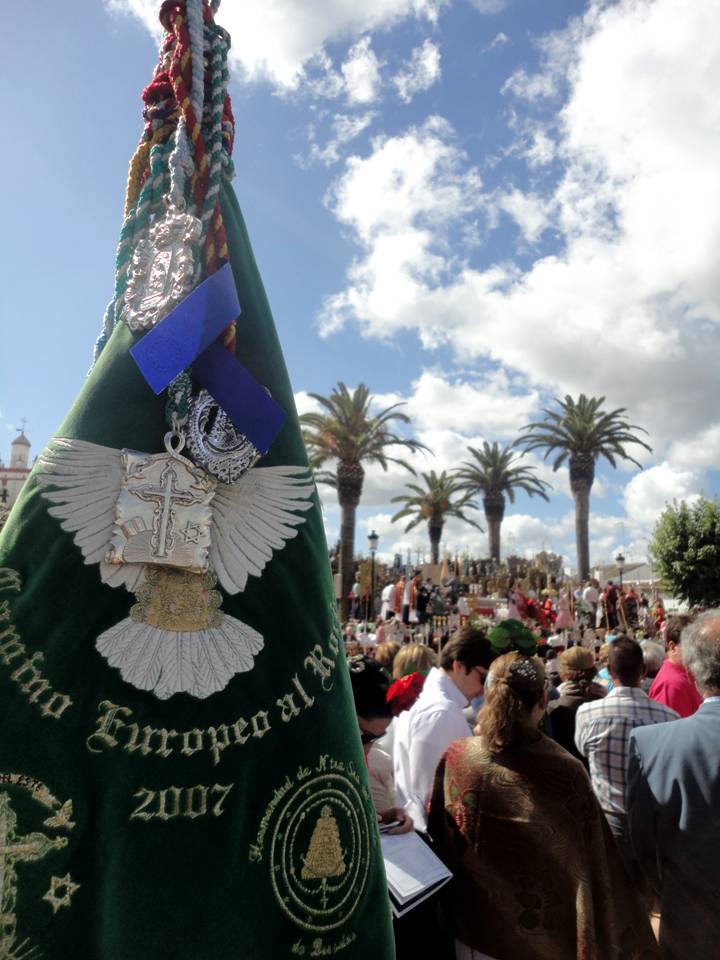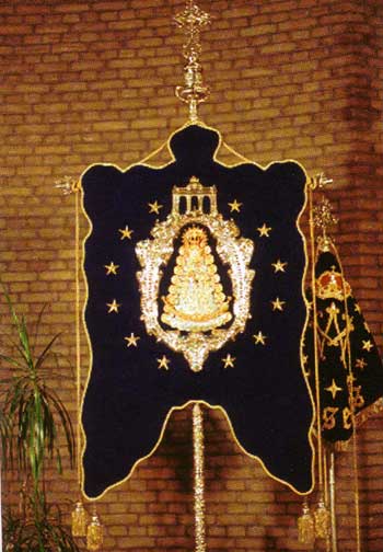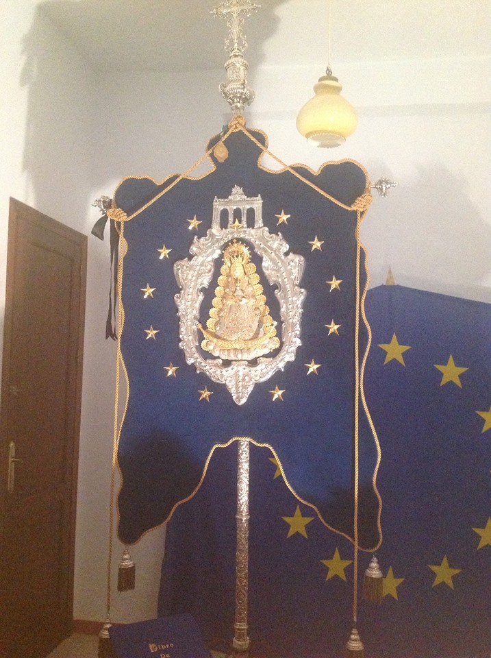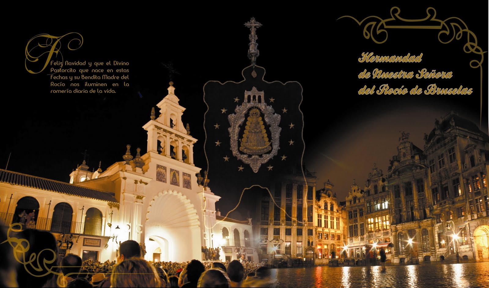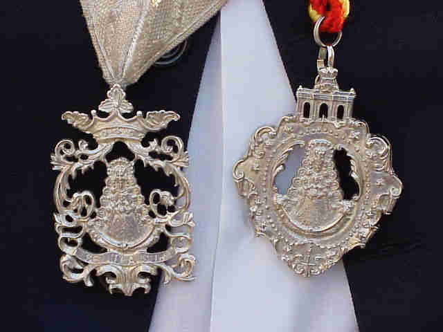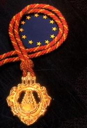 Está confeccionada en plata con un dibujo similar al del Simpecado. La Virgen con sus atributos de Reina está rodeada por un rosario colocado a la manera de cruz pectoral. Bordura con estrella de cuatro puntas y doce estrellas de 5 puntas. Está timbrada por el arco, símbolo del cincuentenario de la ciudad de Bruselas. Pende de un cordón rojo y gualda.