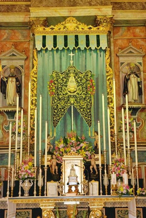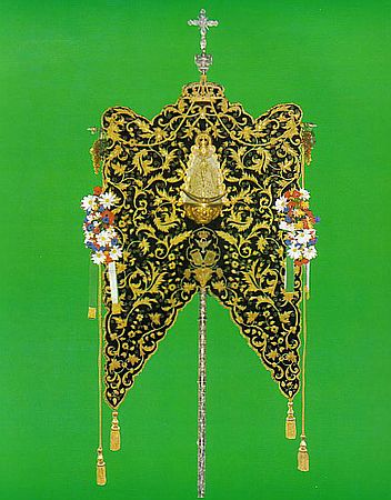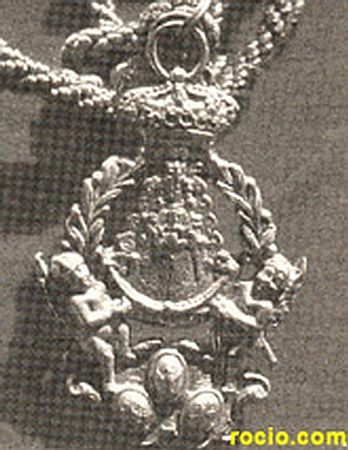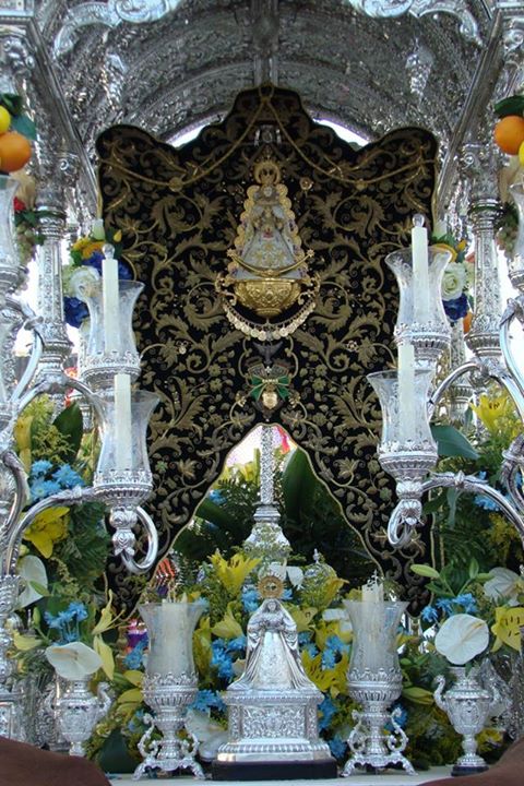 La base de la imagen de Ntra. Sra., está sostenida por dos angeles, que a su vez se apoyan en una cartela de pergamino ajironado, donde se embuten tres escudos. El primero lleva el collar de «El Carambolo». El segundo, una paloma de frente con las alas desplegadas, representando al Espíritu Santo. El tercero , lleva la simbología mariana.