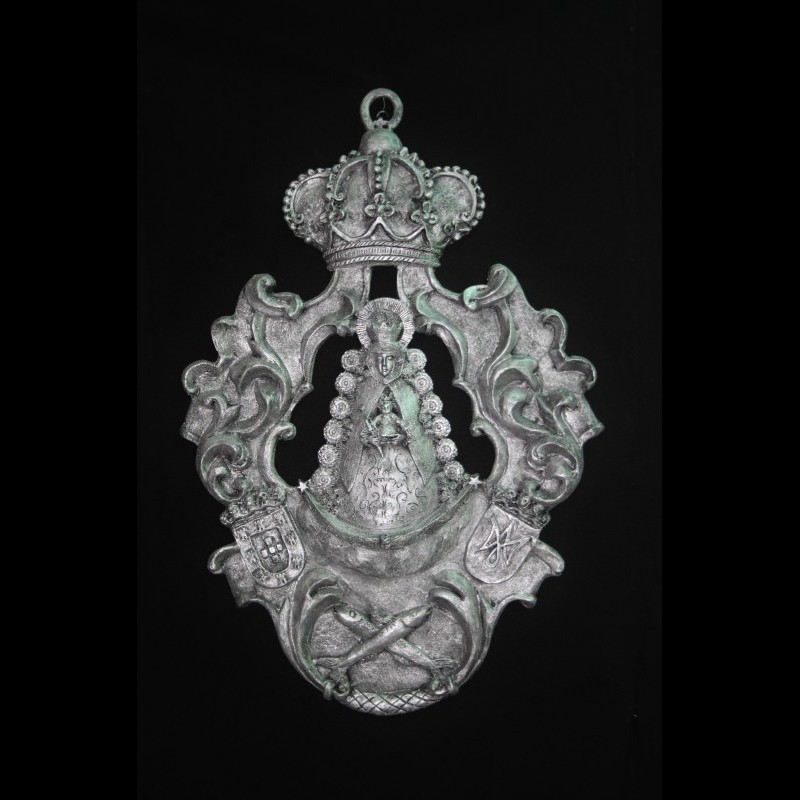 Fabricada en metal plateado, la imagen de la Virgen, en su caracterización de «Reina», está rodeada de hojas de acanto que surgen de la parte inferior de la medalla, donde dos peces en aspa sostienen el conjunto, que remata en su parte superior en una corona real.
