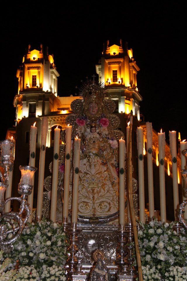 Cuatro ramilletes de flores centran y dan relevancia a la imagen de la misma. Todo ello rematado por la Corona Real, símbolo de la Majestad de la Santísima Virgen Maria. Bajo la misma la alegoría del Espíritu Santo en forma de paloma con unos rayos realizados en oro dirigidos hacia la Imagen de la Virgen.