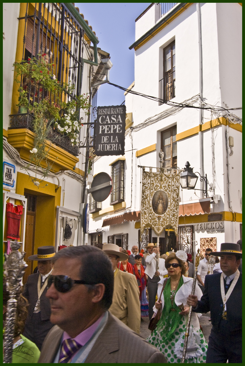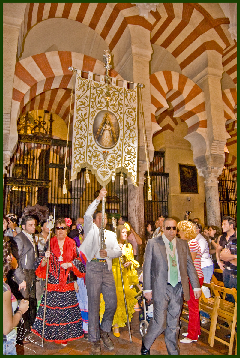 Junto a la documentación descrita se adjunta el oficio del obispado, de fecha 21 de mayo de 1935, en el que se acepta que dichos devotos asistieran en colectividad a las próximas fiestas en honor de la Virgen del Rocío, en su santuario de las marismas almonteñas. En este año de 1935 los cultos que estos cordobeses ofrecieron a su Titular se pudieron celebrar con gran brillantez. En la prensa del día 8 de junio aparecía una nota informando que habían marchado a Almonte para asistir a los actos del Rocío unas setenta personas y que se habían enviado además cuarenta y dos caballos que utilizarían los romeros. Terminaba la noticia anunciando que “mañana saldrán cien más con los estandartes”. El nutrido número de participantes nos da idea de que la devoción rociera estaba bastante extendida entre los cordobeses.