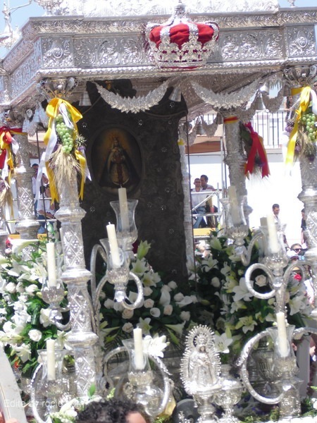Fabricada en metal plateado con Ntra. Sra. caracterizada de «Reina»; con diadema, compuesta de múltiples rayos que alternan sus remates en estrellas de seis puntas y el central en una cruz, una corona real, rostrillo adornado con piedras preciosas, ráfagas, formada por placas de formas lobuladas y alineadas a ambos lados de la Virgen, un cetro, el «Pastorcito» en los brazos, igualmente con atributos reales y una saya barrocamente bordada, prototipo de los vestidos señoriales de moda en el siglo XVII. Se completa el diseño con grandes rosas alineadas entre la ropa y las ráfagas. Dos ángeles a los lados de la Virgen, de considerable tamaño, en relación con ella sostienen una corona real. Los querubines se apoyan en diversos adornos que rematan en punta en una cartela con los elementos siguientes: una nave fenicia sobre espigas de trigo y dos peces en aspa, que reproducen los elementos del escudo de Coria. Pende de un cordón rojo