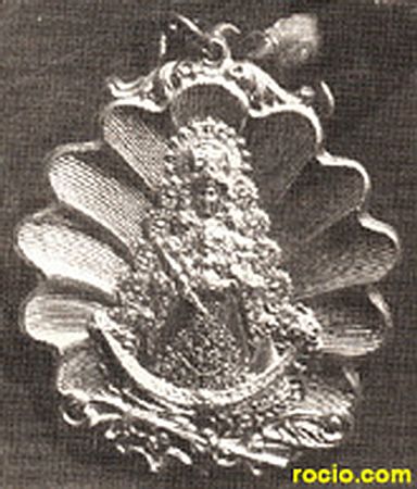 Medalla realizada en metal color plata, donde la imagen de Ntra. Sra. como motivo central, se encuentra sobre una concha, rematada por adornos de hojas de acanto, y en su base con otros motivos florales.