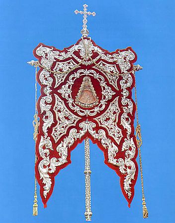 1977: Se realiza el tercer y actual Simpecado, sufragado por los hermanos de la Hermandad, en los talleres del orfebre sevillano D. José Jiménez Jiménez. Realizado en plata repujada, con la Virgen en el centro del mismo material pero policromada , todo ello sobre terciopelo rojo gránate y con borlones plateados, la vara portasimpecado también es de plata repujada rematada con la primitiva cruz del primer simpecado también del mismo material.