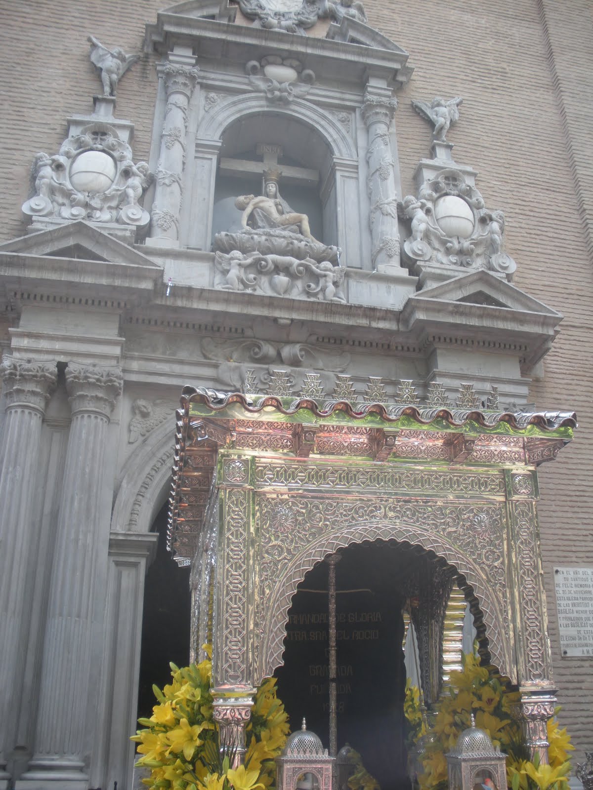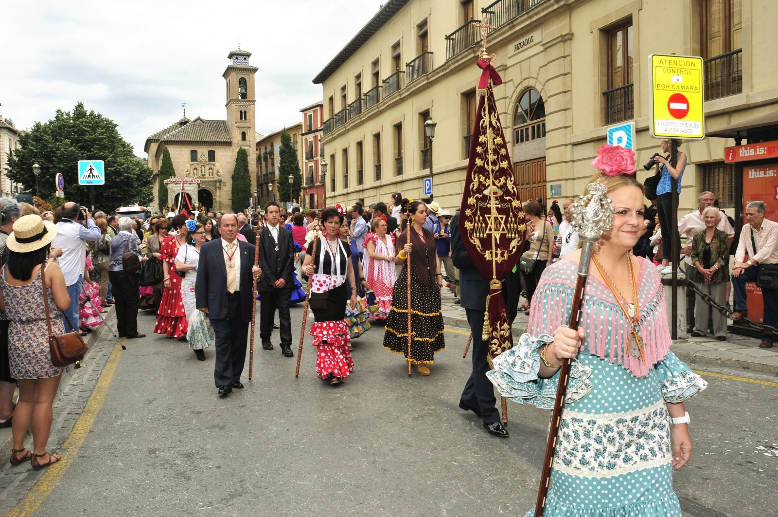 Ya en 1980 sale el Simpecado camino del Rocío desde la Iglesia de San Pedro, en las faldas de la Alhambra, y junto al rio Darro. Se paso por la Virgen de la Angustias, patrona de Granada, y se cogió dirección a la vega, bajo un templete de tela de flecos realizado con los enseres de varias cofradías, varales de la entrada de Jesús en Jerusalén, ánforas tuliperos de Nuestro Padre Jesús de la Sentencia y pebeteros de la cofradía de las Penas, así como la imagen de la Virgen de las Angustias presidiendo la improvisada carreta cuya base fue un regalo de D. Antonio Checa, segundo mayordomo de la Hermandad, esta es la carreta que ha llevado la Hermandad de Granada en el año del 2005 por el problema de la lengua azul, ya que la carreta de plata es muy pesada para ser tirada por mulos. Fuente: Hdad. de Granada (Pinfano)