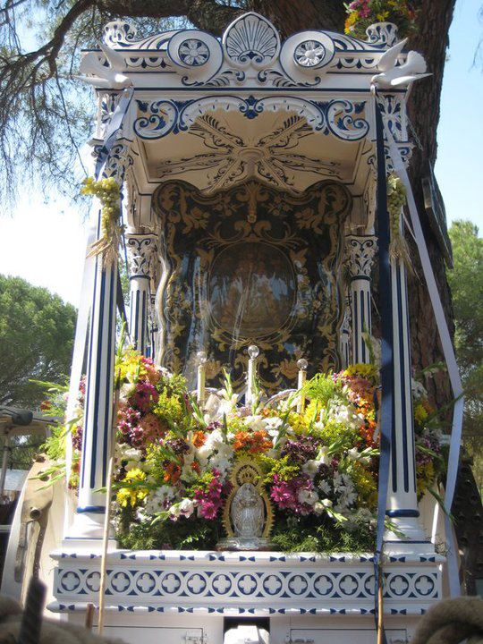 La Hermandad de Hinojos conserva la misma carreta-templete para el Simpecado que estrenó el año de su fundación, realizada en madera pintada con los colores blanco y azul. En determinadas solemnidades este templete se colocaba en lugar elevado del presbiterio de la iglesia, sirviendo de altar de cultos.