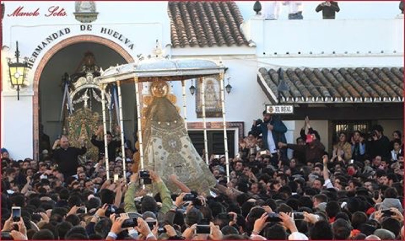 Las primeras noticias de la devoción onubense por la Virgen del Rocío datan de 1747, donde hay referencias de donativos para una “misa rezada a nuestra Señora del Rocío de la villa de Almonte”. La leyenda dice que, estando unos barcos pescando en las marismas del Rocío, los marineros vieron un resplandor y unos fuegos artificiales que les llamaron la atención, y al aproximarse vieron la fiesta a la Virgen, no cesando de ir desde entonces cada año. Desde 1813 ó 1814 parece ser que iban familias por su cuenta, cada vez más numerosas, pasando después a ser grupos que se reunían en la Iglesia Mayor de San Pedro y en la de la Concepción. A mediados de siglo comienza la futura Hermandad a hacer acto de presencia en el Santuario de Almonte con recogimiento mariano, alegría y gran amor hacia la Blanca Paloma. El 25 de mayo de 1845 nace en la calle Miguel Redondo D. Francisco Carrasco Ortiz, “el polaco”, que como su padre José sería seguidor de la facción llamada polaca del partido moderado, liderado por D. José Luis Sartorius, conde de San Luis, de supuesto origen polaco. Nuestro hombre se dedicó a las faenas de la mar, y en su casa de la calle Sevilla (hoy Berdigón) siempre tuvo una imagen de la Virgen del Rocío, alrededor de la que se reunían regularmente amigos de su padre y suyo, como Juan Hernández Toscano, Juan García García y Juan de la Corte y Mora, acaudalado terrateniente.