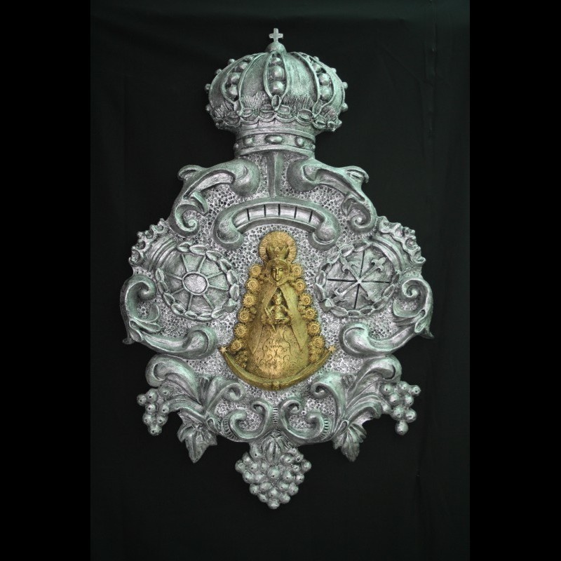 La insignia de los Hermanos es una medalla pendiente de un cordón morado, en metal plateado o plata. En la parte central aparece la imagen de la Virgen del Rocío en metal dorado u oro. Sobre esta imagen se sitúa la corona Real. A su izquierda se puede contemplar el escudo de la Ciudad de Jerez de la Frontera, y a su derecha el escudo de la Orden de los Dominicos. Todo el conjunto queda enmarcado por racimos de uva y hojas de parra, haciendo alusión a la tradicional vinculación de nuestra ciudad con el vino.